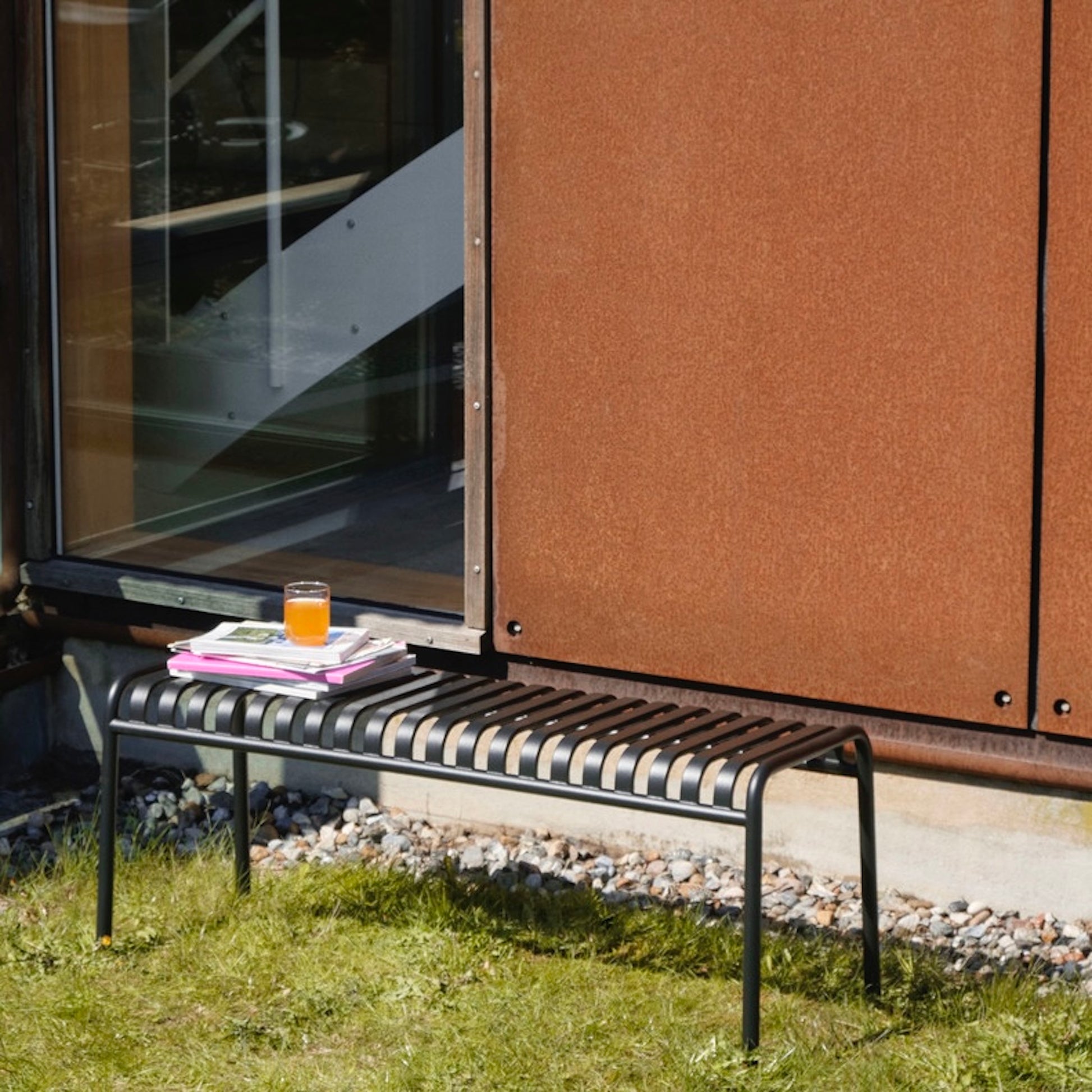 玄関先でのちょっとした腰かけや庭での読書、BBQやピクニックにも活躍するPALISSADEベンチ。使わないときは壁際に寄せておくだけで、省スペースで収納できます。背もたれのないシンプルなデザインは、どの方向からでも自由に座ることができ、限られたスペースでも圧迫感を与えません。