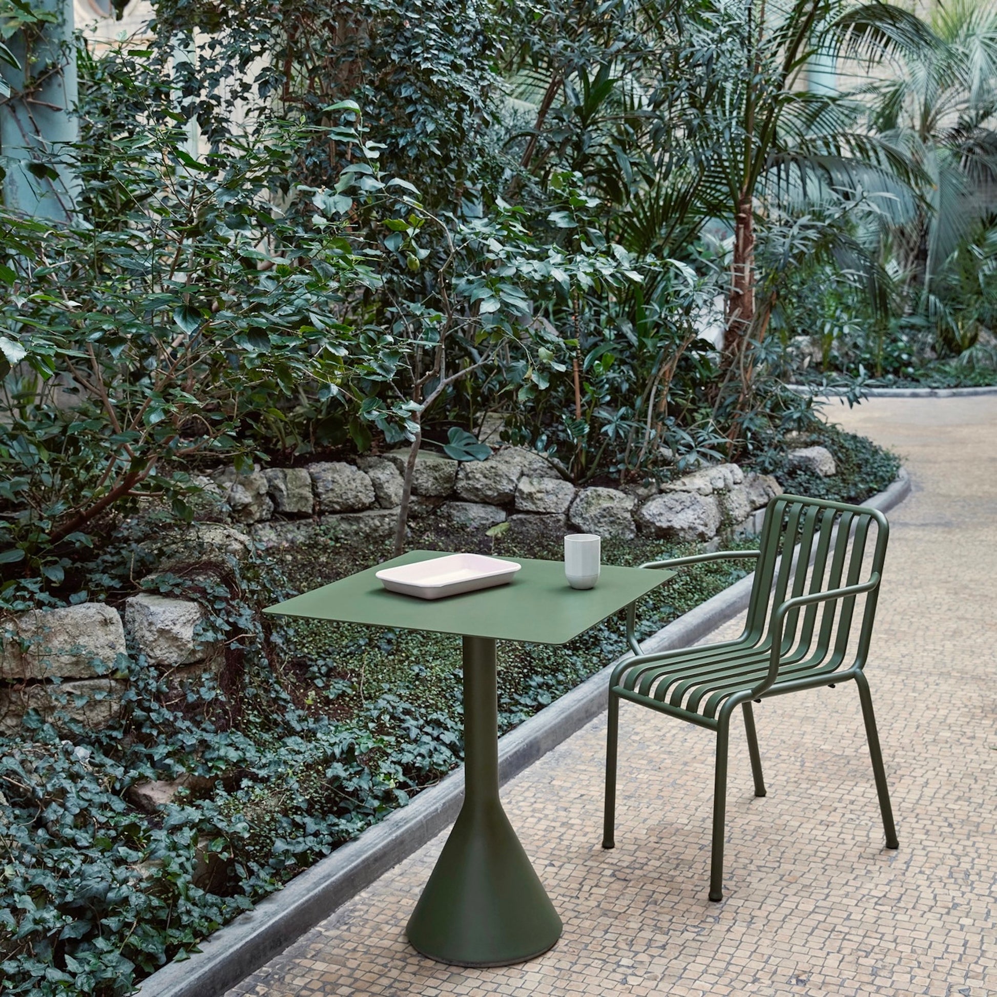 屋外用家具PALISSADEシリーズを完成させるために、フランスのデザインデュオ、ロナン&エルワン・ブルレック兄弟がテーブル開発の願いを持ち、HAYが協力してデザインした「CONE TABLE(コーンテーブル)」。