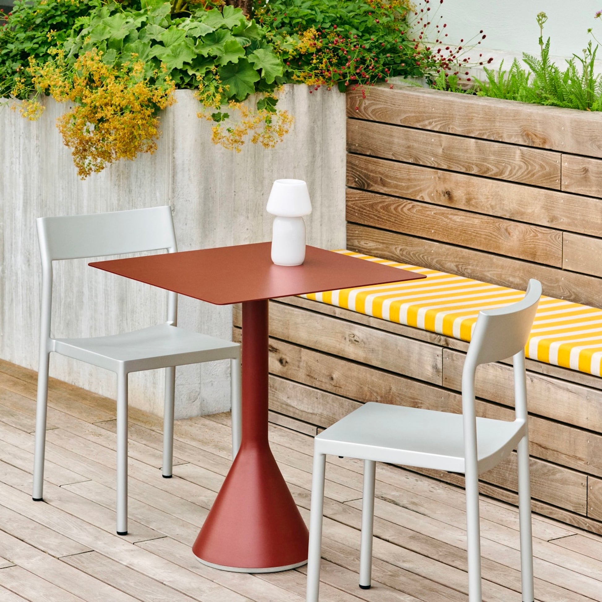 屋外での使用に適した耐久性と弾力性に優れた粉体塗装スチールを特別に設計し、さらに劣化を防ぐために屋外用の塗装で仕上げました。コンクリートの土台があることで、天候の影響を受けやすい屋外環境でも安定感を損ないません。